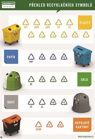 Kam co patří. Symboly různých recyklovatelných materiálů. A jinak: na popelnici by vždycky měla být nálepka, co do ní patří. Pro zvětšení klikněte vpravo nahoře.