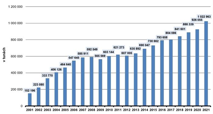 Celkové množství využitých odpadů z obalů. Aneb třídíme čím dál líp. Data vyplývající ze statistik neziskovky EKO-KOM. Pro zvětšení klikněte v pravém rohu.