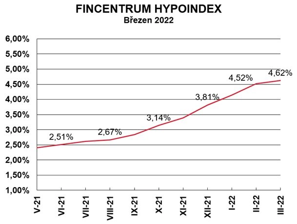 Průměrný nabídkový úrok 4,62 % se vztahuje k 7. březnu a pro úvěr do 80 % odhadní ceny nemovitosti (jde o ukazatel známý pod zkratkou LTV). Za poslední měsíc vzrostla průměrná nabídková sazba hypoték o 0,1 procentního bodu, oproti lednu už o téměř půl procentního bodu. Loni v květnu byla průměrná nabídková sazba hypoték na úrovni 2,4 %.