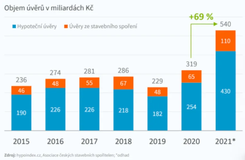 Banky a stavební spořitelny loni půjčily na bydlení rekordních 540 miliard korun, z toho hypotéky dělaly 430 miliard. Odhaduje to skupina ČSOB, lídr na trhu financování bydlení, jejíž součástí jsou Hypoteční banka a ČSOB Stavební spořitelna. Dosud rekordní byl rok 2020 s celkem zhruba 315 miliardami. Rekordní byl loňský rok i z pohledu počtu prodaných hypoték, jak dokládají data hypoindexu.