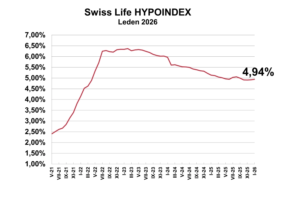 Průměrná úroková sazba nových hypoték včetně refinancování na začátku nového roku mírně stoupla na 4,94 %. Vyplývá to ze statistiky Swiss Life Hypoindex, která sleduje nabídky většiny bank.