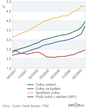 Splácet je přece snadnější než spořit. S takovým sloganem loví banky klienty na spotřebitelské úvěry. Naštěstí pouze na Slovensku. Do podobně agresivního marketingu se české banky zatím nepouští. Nejspíš vědí proč. Kvůli finanční krizi a hospodářské recesi roste riziko, že domácnosti nebudou schopny úvěry splácet. Podle nejnovější zprávy o finanční stabilitě, kterou publikovala v úterý Česká národní banka(ČNB), se podíl nesplácených úvěrů na všech úvěrech domácností zvýší letos ze čtyř na sedm procent.