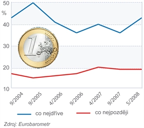 Češi jsou na tom podobně. Téměř polovina z nich si sice myslí, že euro české ekonomice prospěje. Souhlasí i s tím, že společná měna měla pozitivní dopady na země, které už jsou součástí eurozóny, její brzké přijetí Češi přesto nepodporují. Pro co nejrychlejší vstup do eurozónyje dlouhodobě jen 18 procent Čechů. Co nejpozdější přijetí eura preferovalo letos v květnu 42 procent dotázaných. Podobný paradox zaznamenali výzkumníci Eurobarometru i v Polsku a pobaltských státech.