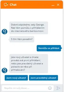 Česká spořitelna spustila na přihlašovací stránce do internetového bankovnictví chatbota. Ten bude klientům pomáhat s prvním přihlášením do přímého bankovnictví George, ale i v případech, kdy neobdrží potvrzovací SMS zprávu pro přihlášení, vyplní špatně své přihlašovací údaje nebo dojde k zablokování jejich účtu.
