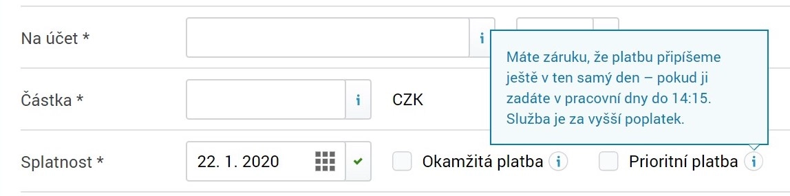 Teprve když jste takový termín nestihli, zajímejte se o prioritní, expresní či urgentní úhradu (jde o tři různá pojmenování pro totéž – v praxi se nijak neliší). Ještě před pár lety šlo o jediný způsob, jak převést peníze ještě ve stejný den.