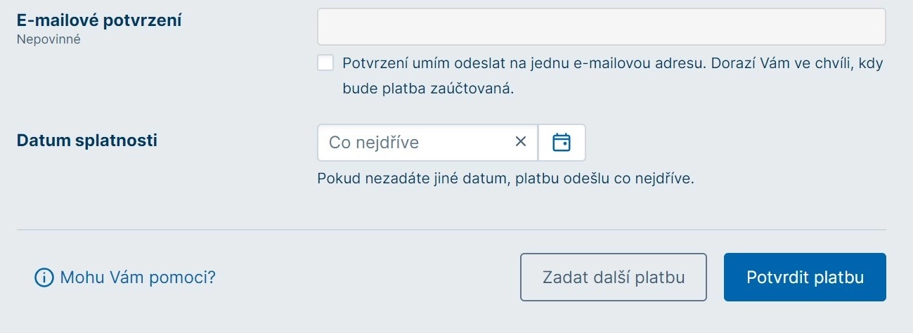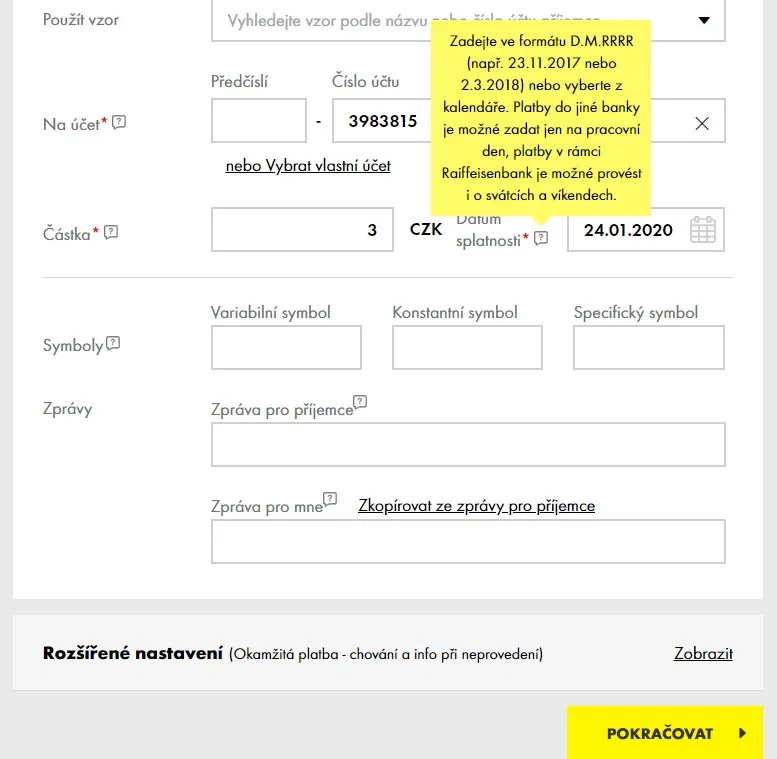 Stejně jednoduché je to v Raiffeisenbank. Zvídavé klienty však trochu mate, když po kliknutí u data splatnosti píše, že platbu do jiné banky lze zadat jenom na pracovní den. To platilo před spuštěním okamžitých plateb – teď se peníze převedou kdykoliv, pokud už to cílová banka zvládá.