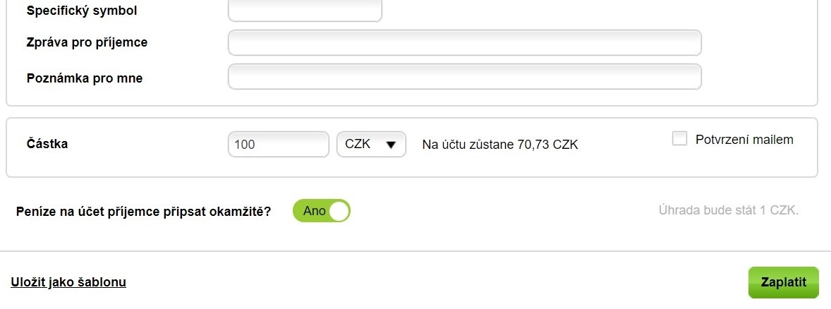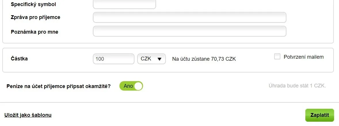 Některé banky nabídnou možnost okamžité platby až poté, co zadáte kód cílové banky, případně číslo účtu. Nejdéle si počkáte u Creditas: Ani když zadáte banku, která už okamžité platby umí přijímat, systém vám tuhle možnost stále nezpřístupní. Je potřeba zadat ještě převáděnou částku – teprve pak se ukáže i zaškrtávací pole pro okamžitou platbu.