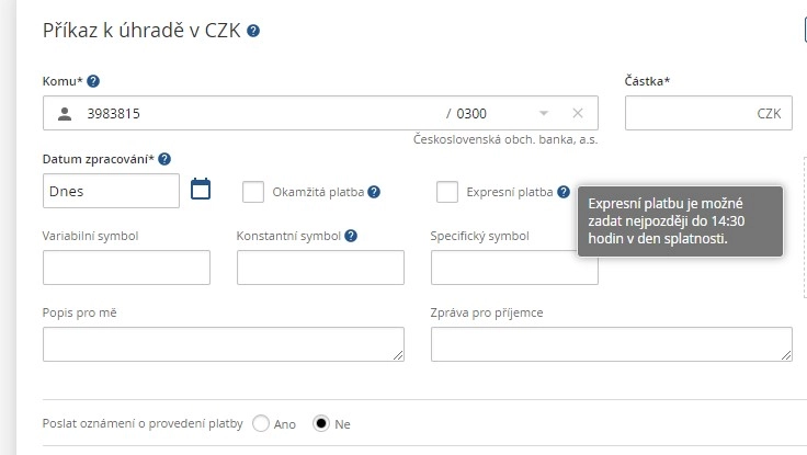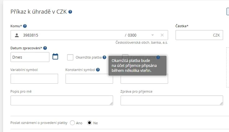 Podívejme se na situaci, kdy chcete v internetovém bankovnictví rychle převést peníze na účet do jiné tuzemské banky. Obě už přitom dokážou okamžité platby.