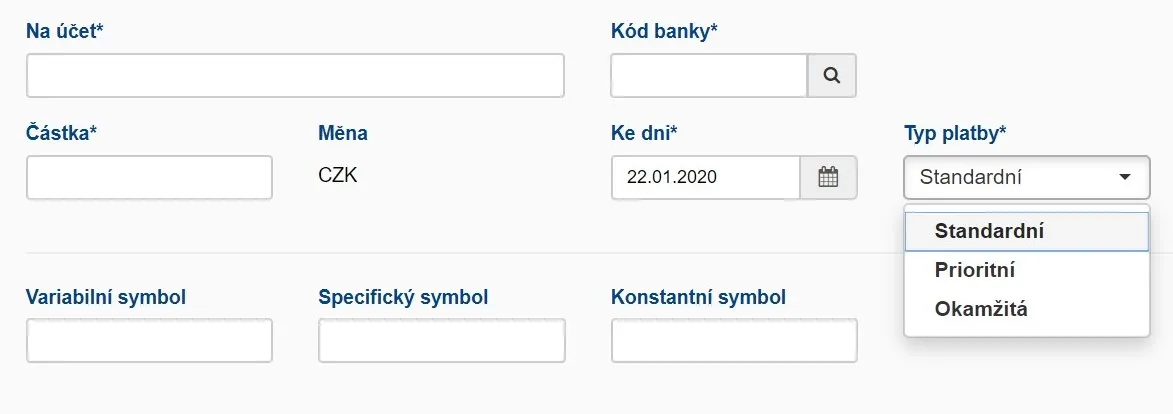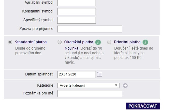 U ostatních bank si musíte sami vybrat. Nápovědu většinou získáte při podržení myši nad zvolenou variantou. Některé banky vám nabídnou dvě „nadstandardní“ možnosti s tím, že když žádnou nezvolíte, pošlou platbu jako standardní – tuhle volbu si přitom aktivně nezaškrtáváte. Jiné dávají na výběr ze všech tří variant.