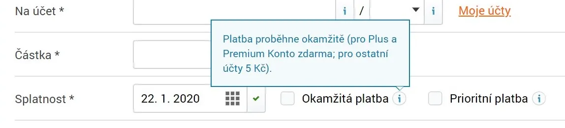 Pro začátečníka zřejmě nejméně přehledný způsob má Fio banka. Na výběr dává mezi standardní, prioritní a okamžitou platbou – v tomhle pořadí. A chybí nápověda, která by přímo při zadání vysvětlila rozdíl. Na druhou stranu je sympatické, že i platbu, kterou zadáte s dnešní splatností jako standardní, pošle jako okamžitou – když to cílová banka umožňuje.