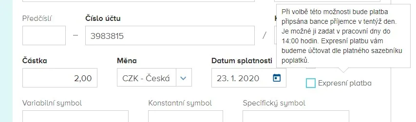 | Expobank | 99 Kč | 12:30 | prioritní, expresní, urgentní |