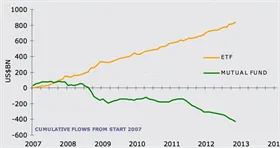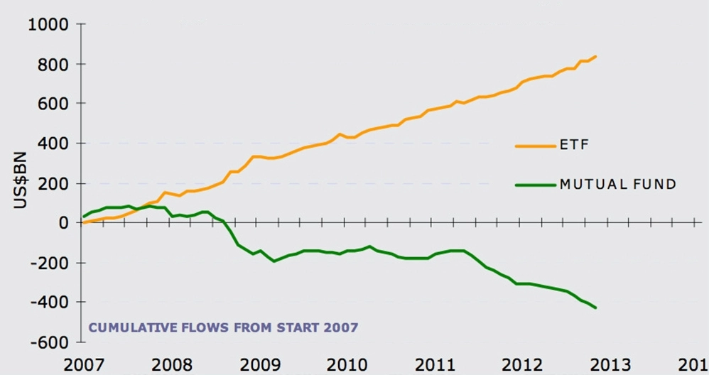 Jak můžeme vidět na obrázku vlevo, obliba ETF roste a to na úkor tradičních podílových fondů. Hlavním důvodem je zmíněná nižší nákladovost ETF. Sekundárním důvodem může být nedůvěra mnohých investorů v přidanou hodnotu aktivně spravovaných fondů. Průšvih totiž je, že většina podílových fondů, které se tváří jako aktivně spravované, také více méně jen kopíruje vybraný akciový index, ale s vyššími náklady na správu, přičemž v tomto případě neospravedlnitelnými. Z toho vzniká dojem, že tradiční akciové fondy nejsou schopné porážet výkonností indexové ETF. S tím si však dovolím zásadně nesouhlasit, ovšem je potřeba sledovat pouze tu hrstku akciových fondů, které jsou skutečně aktivně spravované.