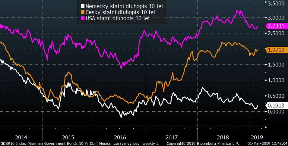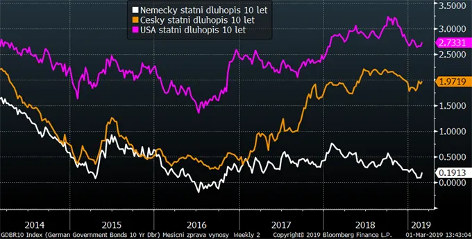 Výnosy státních dluhopisů se letos prozatím drží na stejných úrovních jako na konci roku a spíše hledají směr. Vždyť ani centrální banky prozatím neví, co se zpomalující, ale stále solidně rostoucí ekonomikou dělat. V nejbližší době lze čekat spíš stagnaci výnosů.