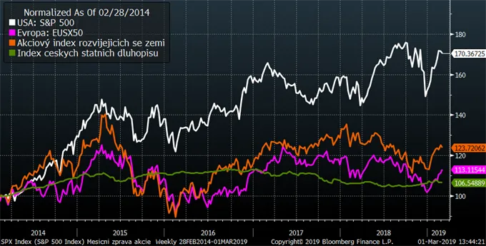 Prognózy amerického Fedu sice potvrzují i nadále solidní růst, ale varují před situací v Evropě a nerozvinutých zemích. Americká centrální banka proto oznámila, že si možná dá pauzu v utahování měnové politiky. Ceny akcií to postrčilo nahoru. K jejich růstu přispěla i naděje na pozitivní řešení obchodních sporů mezi USA a Čínou. A v neposlední řadě hrála roli i solidní výsledková sezóna. Ani ceny dluhopisů nebyly proti. Jen dolar ztratil trochu půdu pod nohama.