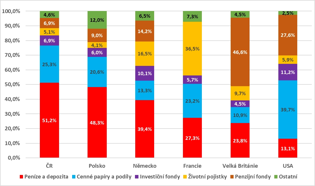Z grafu je patrné, že například domácnosti ve Spojených státech drží v bankovních depozitech pouze 13 % svých úspor, což je asi čtyřikrát méně než v tuzemsku. Zbývající prostředky Američané investují zejména do cenných papírů a podílových listů. Přibližně 54 % z celkového objemu prostředků amerických domácností, které jsou uloženy ve fondech, je umístěno ve fondech akciových, což je 2,5 krát více oproti tuzemskému trhu.