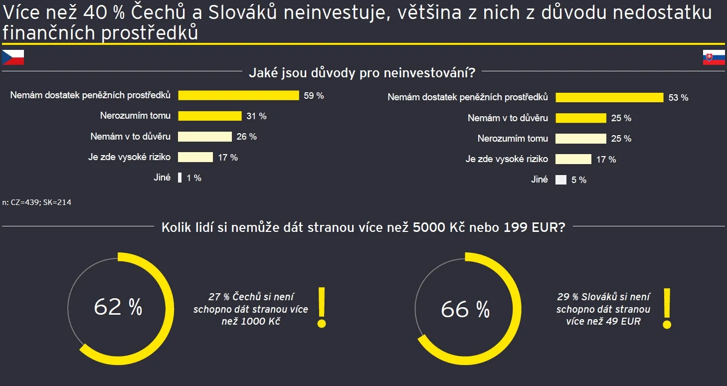 Víc než 40 procent respondentů v obou republikách neinvestuje vůbec. Nejčastějším důvodem je nedostatek peněžních prostředků, dál přežívají vesměs zažité stereotypy spojené s investicemi.