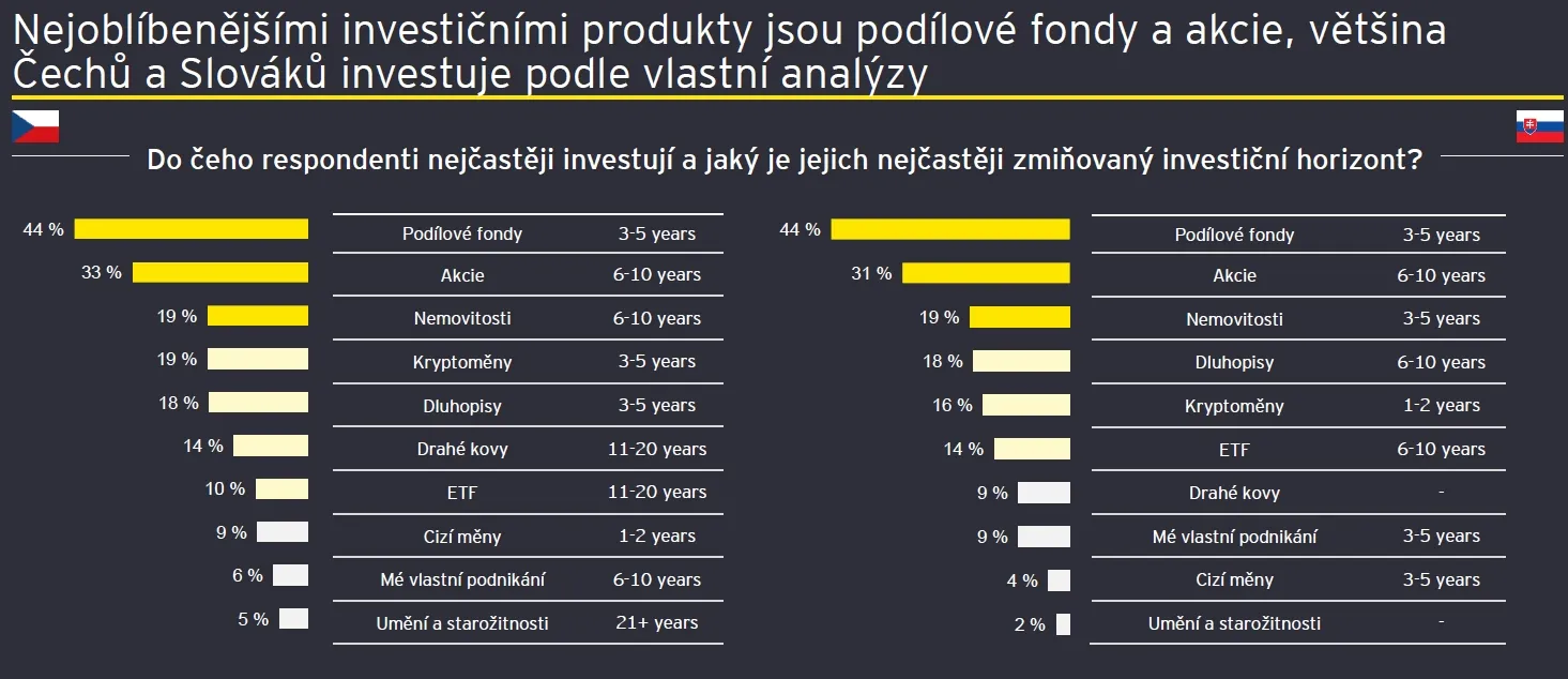 Pokud jde o investiční produkty, tak nejvíce důvěřují podílovým fondům, akciím a nemovitostem, necelá pětina Čechů či Slováků má zainvestováno v kryptoměnách a dluhopisech.