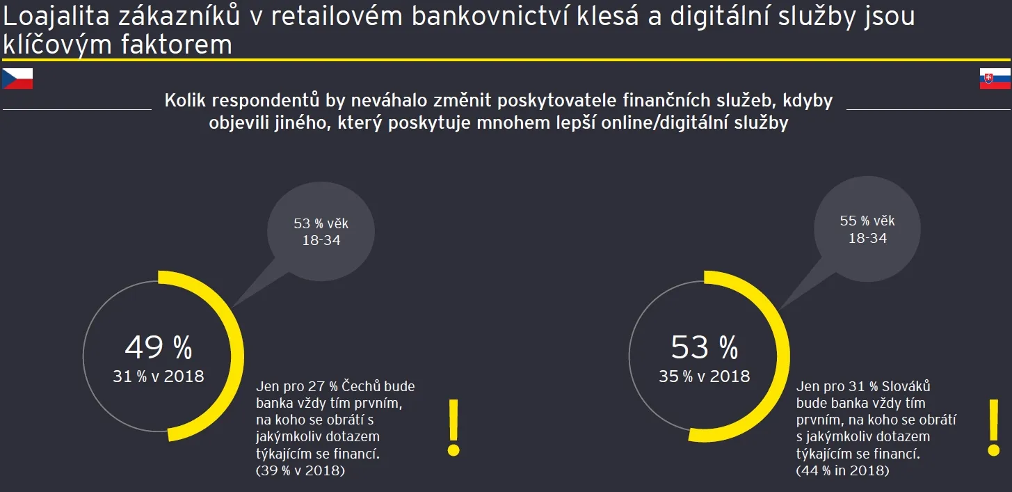 Asi polovina lidí by neváhala změnit poskytovatele finančních služeb, kdyby objevila jiného, který poskytuje lepší online služby. Ještě v roce 2018 to byla přibližně třetina Čechů i Slováků.