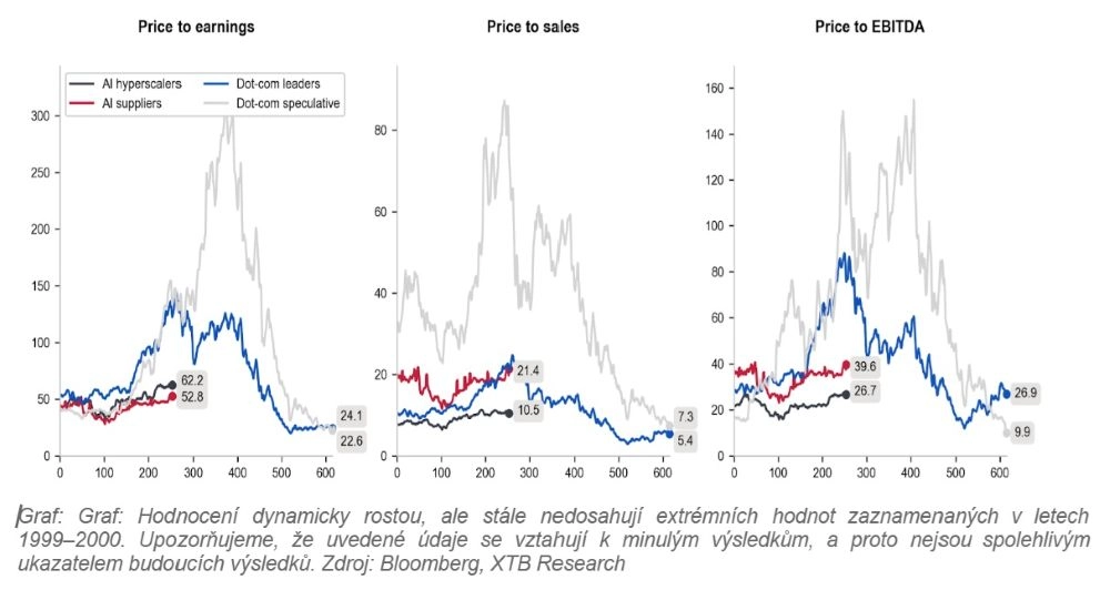 Akciové indexy překonávají rekordní maxima, což mnoha investorům připomíná dotcomovou bublinu. Ocenění společností (P/E, poměr ceny k zisku) je vysoké, ale odůvodněné fenomenálními finančními výsledky. Faktem je, že kvalita podnikání je nesrovnatelně vyšší než během internetové bubliny. Společnosti BigTech generují reálné peněžní toky a jsou v centru největší vlny kapitálových výdajů (investic) souvisejících s umělou inteligencí za poslední desetiletí. Otázka proto nezní pouze „Je to již bublina?“, ale také „Je současný růst udržitelný a kdy se začnou masivní investice do umělé inteligence vyplácet?“