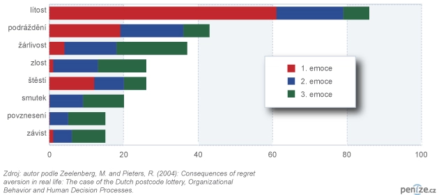 Zeelenberg a Pieters porovnávali, jak možné pocity lítosti ovlivňují rozhodování Holanďanů hrát loterie. Nejdříve přistavili na ulici sto lidí a zeptali se jich: „Představte si, že jste zvažovali koupit si los poštovní loterie, ale neudělali jste to. Potom zjistíte, že vylosovali váš poštovní kód. Vaši sousedé si rozdělí celou výhru a vám nezůstane nic. Jaké emoce by ve vás převládaly?“ Lidé měli na seznamu emocí označit, která emoce by byla pociťovaná jako první, druhá a třetí nejsilnější (graf 1). Lítost byla nejen nejčastější označovanou emocí (86 % případů), ale i nejsilnější (61 % případů).