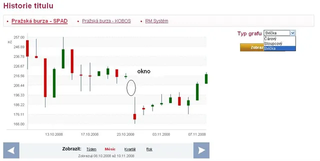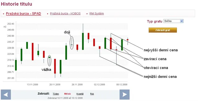 Svíčkový graf zobrazuje pro zvolenou periodu, nejčastěji den, svíci, která vzniká složením čtyř hodnot. Minimální a maximální ceny a otevírací a zavírací ceny v průběhu dané periody. Oproti sloupcovému grafu se ale liší konstrukcí. Pokud cena akcie přes den vzrostla, otevírací cena byla níže než zavírací, je takzvané tělo svíce (tak je ho zobrazujeme na grafech na akcie.penize.cz) zelené, v opačném případě červené. Minimální a maximální cena se do grafů promítá jako „stín“ či „knot“. V případě, že otevírací či zavírací cena splývá s nějakým extrémem, nemá tato svíce knot. Může se stát, že stejná je otevírací a zavírací cena. Takovým svícím, které nemají žádné tělo, se říká „doji“.
