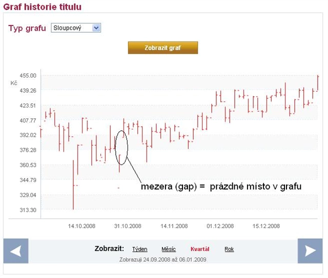 Gap neboli mezera vzniká, pokud je nejvyšší cena dne níže než minimální cena příští den (jak ilustruje obrázek), případně naopak. Techničtí analyticirozlišují několik typů mezer a sledují také to, kdy jsou „vyplněny“, tedy kdy nezaplněné místo v grafu v nějakém dalším obchodním dnu vyplní nový sloupeček.