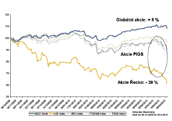 1) Akcie řeckých firem, potažmo všech států PIGS, mají jen velmi malou váhu na globálních akciových trzích. Akciové trhy zemí PIGS, které se vyznačují vysokou mírou zadlužení, ukrajují ze světové tržní kapitalizace pouze asi 3,1 %. Podíl Řecka, které se nyní nachází ze všech států PIGS v nejtěžší situaci, přitom představuje jen nepatrných 0,18 %. Největší, téměř třetinovou váhou jsou zastoupeny Spojené státy, které procházejí výrazněji rychlejším pokrizovým oživením než celá Evropa. Reportovaný vyšší růst amerického HDP, lepší údaje z amerického trhu práce a velmi příznivé firemní výsledky podpořily růst globálních akcií více, než ho oslabily problémy Řecka a PIGS. Bez lepších zpráv z USA by pravděpodobně nerostly ani globální akcie, i kdyby situace v Řecku byla sebelepší.