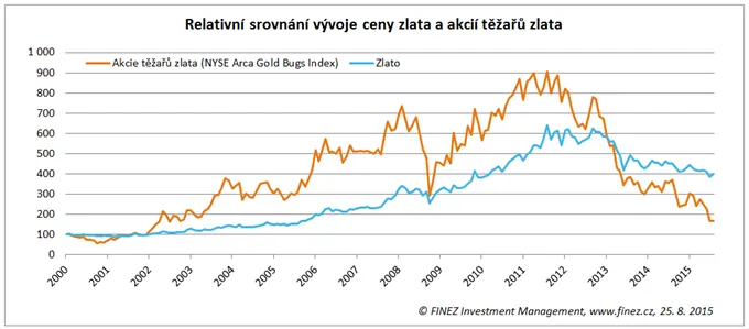 Konkrétně se podívejme na vývoj ceny zlata a akcií těžařů zlata za posledních patnáct let. V roce 2002 začal u zlata desetiletý býčí trh. Ve stejném období začaly také strmě růst ceny akcií těžařů zlata, které představuje index NYSE Arca Gold Bugs. Každá větší korekce ceny zlata přinesla poměrně velké propady v cenách akcií těžařů. Obrat trendu v roce 2011 pak tvrdě dopadl na akcie těžařů, jejichž hodnota za uplynulých pět let spadla o děsivých 80 procent, zatímco cena zlata spadla „jen“ o 40 procent.