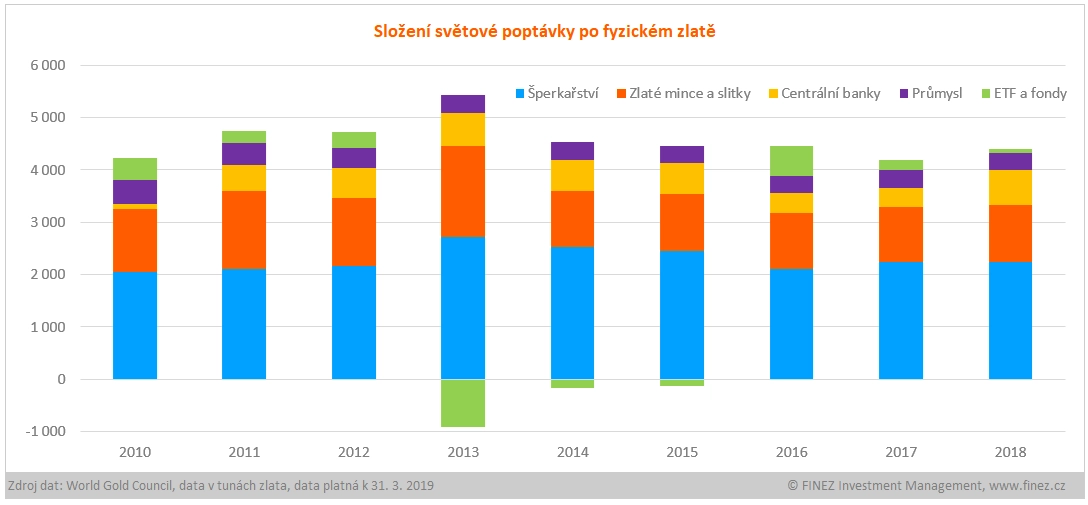 Ještě v roce 2013, kdy cena zlata na trzích prudce spadla dolů, nakoupili investoři 1730 tun zlata. Snažili se evidentně využít situace k „levným“ nákupům v naději, že cena „určitě“ brzy zase stoupne. Trvalo to sice šest let, ale teď se zdá, že zlato má nastartováno k dalšímu růstu, tak uvidíme, co to udělá s poptávkou ze strany investorů. Dá se očekávat, že poroste.