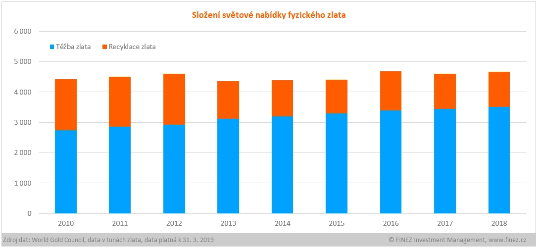 Zároveň ale za posledních deset let o 30 procent klesl objem recyklovaného zlata. Když obě složky na straně nabídky sečteme, celkový objem fyzického zlata dodávaného na trh je velmi stabilní.