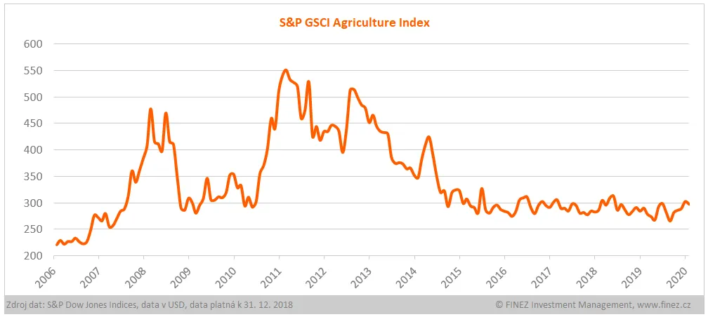 Hodnota indexu S&P GSCI Agriculture v roce 2019 stoupla o šest procent. I tady ale na grafu krásně vidíme, že z dlouhodobé perspektivy jsou ceny zemědělských komodit v průměru stále velmi nízké a hluboko pod průměrem posledních patnácti let.