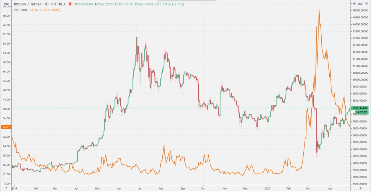Na grafu můžeme vidět vývoj ceny bitcoinu ve srovnání s indexem VIX, zachycujícím volatilitu na americkém kapitálovém trhu. Z grafu můžeme usuzovat, že bitcoin u investorů je stále rizikovou investicí na základě tohoto, že rostoucí volatilita na trzích vyvolává pokles ceny bitcoinu.