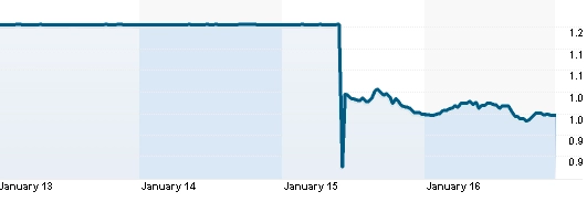Švýcarský frank automaticky skokově posílil z 1,2 franku za euro na jeden frank za jedno euro. V měnovém páru EUR/CHF je frank ve jmenovateli, posílení franku se tedy projeví poklesem hodnoty kurzu eura vůči franku. Jakmile tato zpráva obletěla svět (a to dneska trvá opravdu jen chviličku), klesl kurz nakrátko dokonce až na 0,85 franků za jedno euro. Záhy ale kurz korigoval zhruba k hodnotě 1,05, pak se frank zase držel zhruba na úrovni eura.