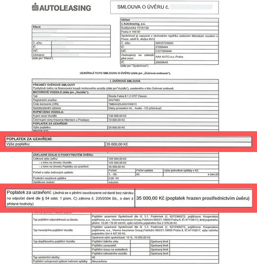 Smlouva o úvěru společnosti s Autoleasing. Poplatek za uzavření úvěru 35 tisíc korun: