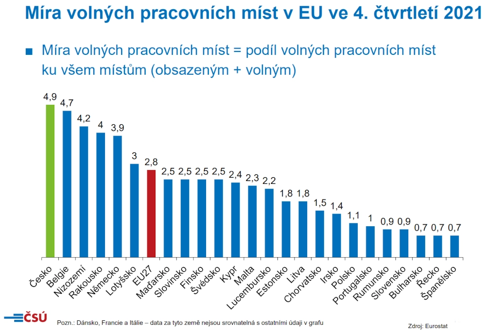 Statistici vyhodnotili také dostupnost volných míst a v porovnání s dalšími zeměmi Evropské unie zde byla na konci roku 2021 práce nejdostupnější.