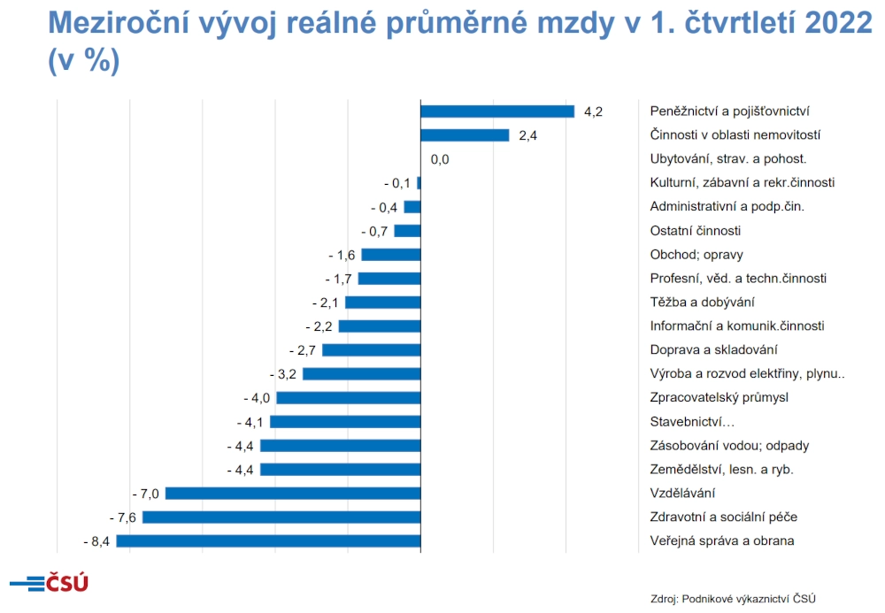 V prvním čtvrtletí letošního roku si s ohledem na inflaci polepšili zaměstnanci v peněžnictví a pojišťovnictví, jejichž průměrná reálná mzda vzrostla o 4,2 % a také pracovníci v oblasti nemovitostí, kterým reálná mzda poskočila o 2,4 %. Do této skupiny ale patří jen 2,9 % zaměstnanců.