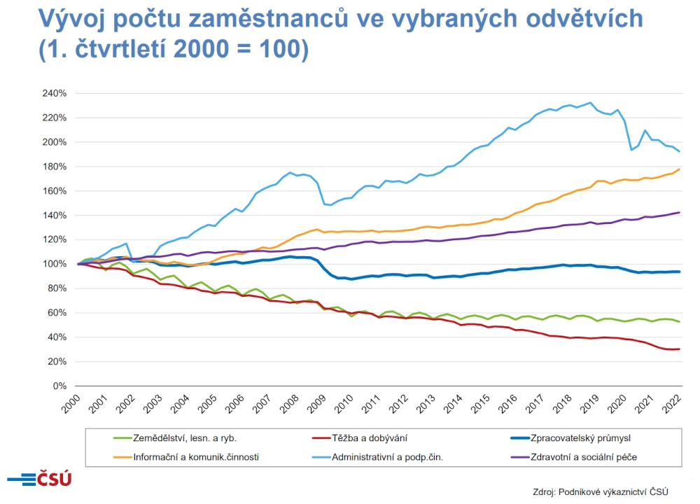 Počet zaměstnanců se v prvním čtvrtletí roku 2022 meziročně zvýšil o 1,1 %. Nejvíce přibylo zaměstnanců v oblasti informačních a komunikačních technologií, celkem 4,5 %. Naopak největší úbytek statistici zaznamenali v odvětví těžby a dobývání, kde počet zaměstnanců klesl o 10,4 %.