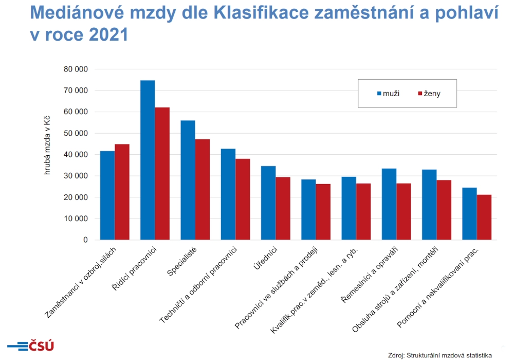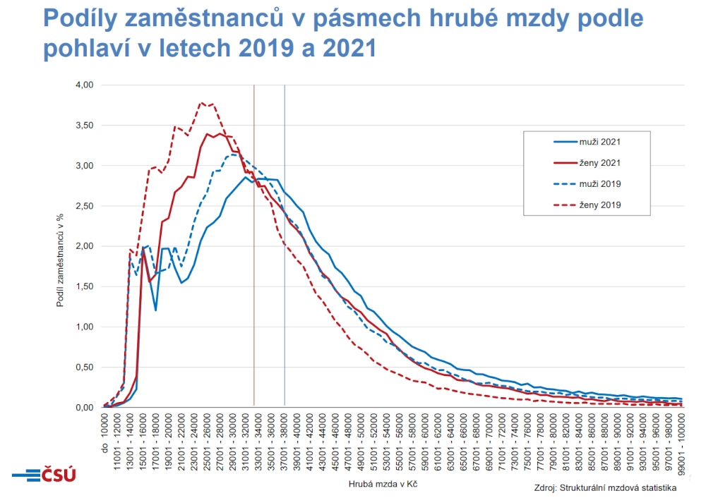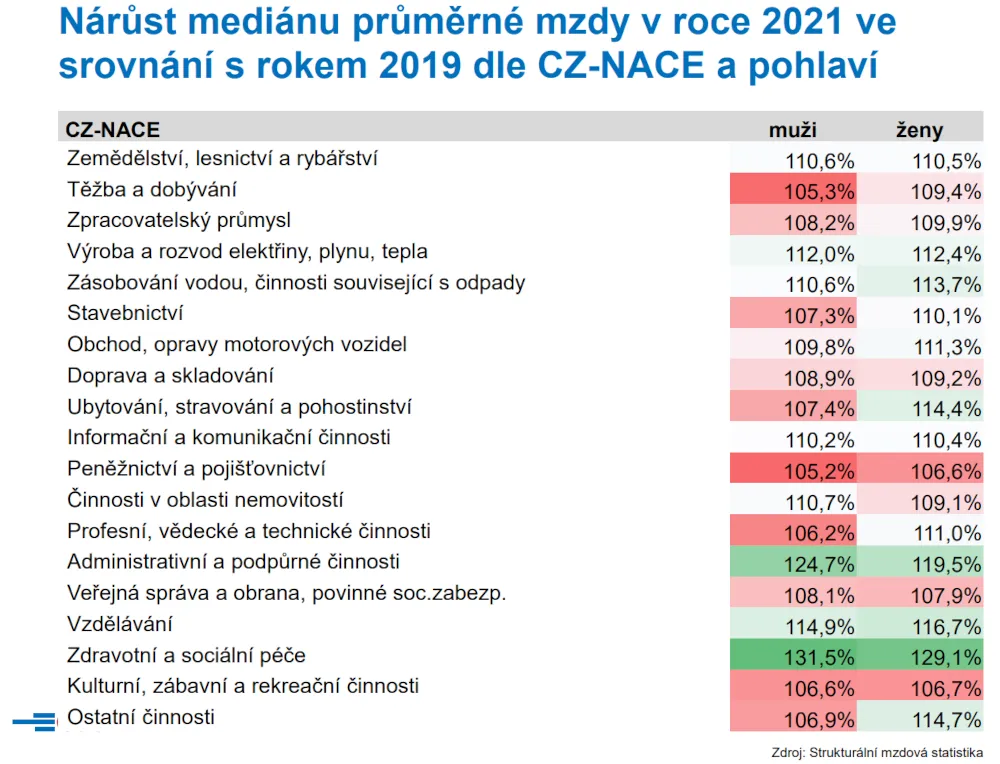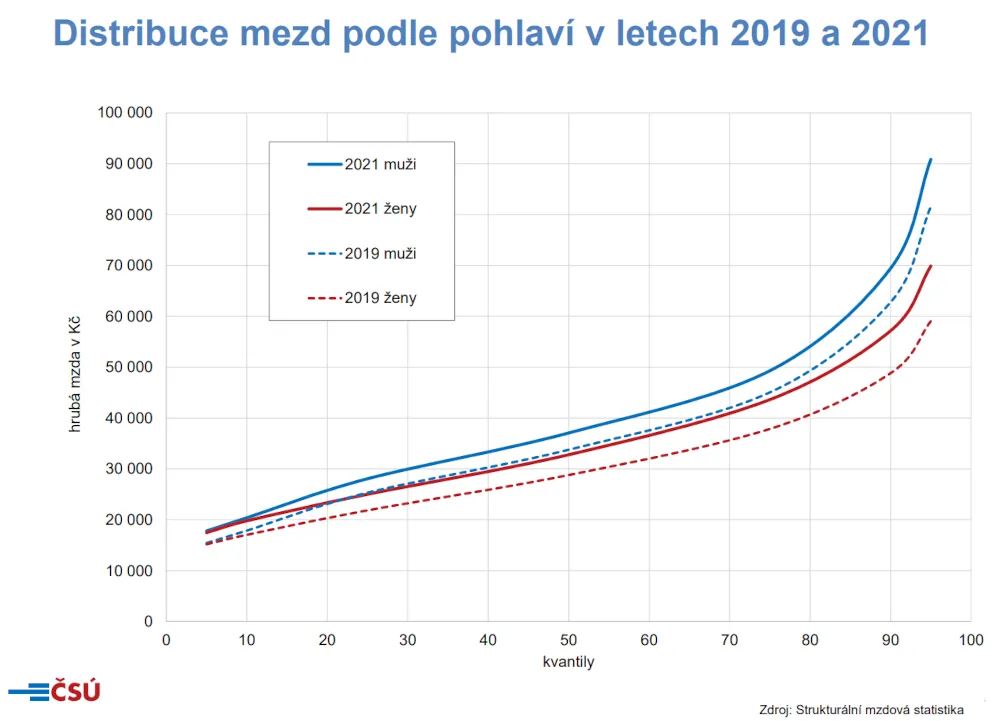 Mzdy žen rostly v posledních letech plošně rychleji než u mužů a rozdíl mezi mzdovým mediánem mužů a žen klesl z 18,7 % na konci roku 2019 na 16 % na konci roku 2021. Docházelo k tomu především proto, že ženy pracují v odvětvích, kde se více přidávalo. I přesto tři čtvrtiny žen stále ještě nedohnaly ve své kategorii tu úroveň, kterou měli muži před dvěma lety.