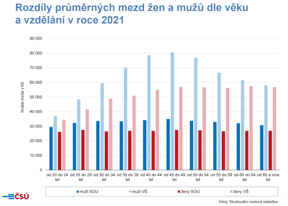 Statistici se podívali také na rozdíly průměrných mezd žen a mužů podle věku a vzdělání. U mužů s vysokoškolským vzděláním je vidět, že průměrná mzda na začátku jejich kariéry rychle roste a pak klesá. U vysokoškolsky vzdělaných žen roste postupně a až v druhé polovině kariéry ženy takřka dosáhnou úroveň mzdy, které muži dosahují v kariéře po 30. roce. Největší mezera je u žen ve středním věku, což je spojeno s mateřstvím.
