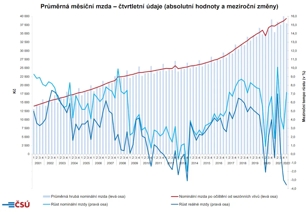 Průměrná hrubá měsíční mzda v prvním čtvrtletí roku 2022 vzrostla meziročně o 7,2 % na 37 929 korun. Reálně si ale většina zaměstnanců pohoršila kvůli vysoké inflaci, která v prvním kvartálu letošního roku dosáhla 11,2 %. I když růst mezd zůstává rychlý, na rekordní zdražování to nestačí a kupní síla většiny Čechů se letos snižuje.