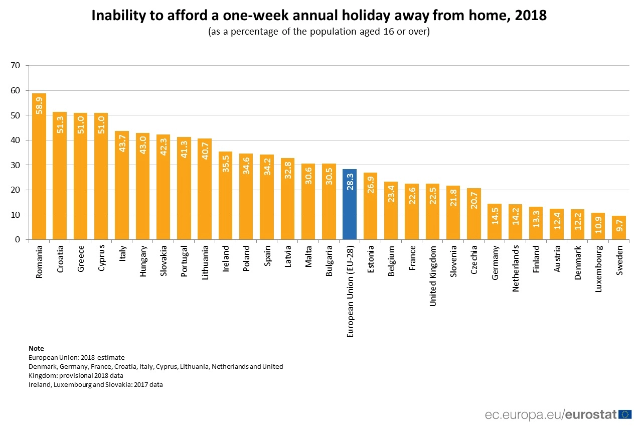 Víc než čtvrtina (28 procent) občanů Evropské unie nemá peníze na aspoň týdenní dovolenou mimo domov. Ukazuje to nové porovnání Eurostatu.