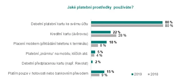 Výrazně roste obliba přímých plateb chytrým mobilem – z loňských osmi na letošních 18 procent. Pět procent lidí používá platební nálepku („známku“) na mobilu, klíčích a podobně. Dvě procenta pak uvedla, že platí debetní předplacenou kartou, například od aplikace Revolut.