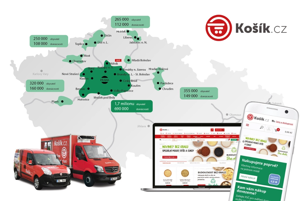 Košík.cz naposledy rozšiřoval svou závozovou oblast v září loňského roku, kdy začal rozvážet potraviny a potřeby pro domácnost do Mladé Boleslavi a Kosmonos. Služba je k dispozici zhruba čtyřem milionům lidí v Praze a středočeských městech, na Plzeňsku, Liberecku, Ústecku, v Hradci Králové a na Pardubicku a také v okolí Teplic, Mostu a Chomutova.
