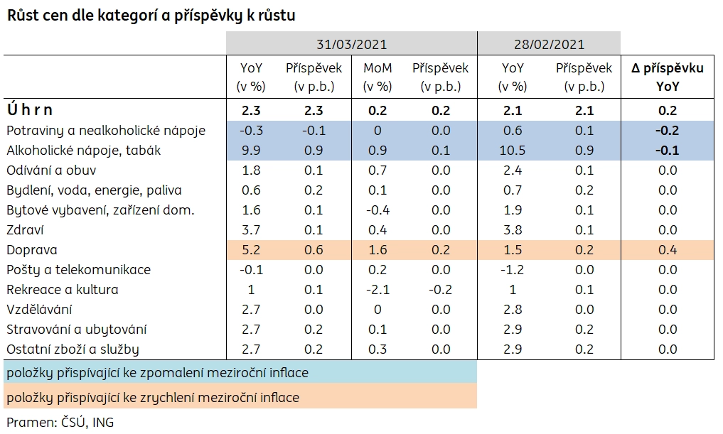 Zdroj: ING Bank, ČSÚMíra inflace vyjádřená přírůstkem průměrného indexu spotřebitelských cen za posledních 12 měsíců proti průměru předchozích 12 měsíců byla v březnu 2,8 %.