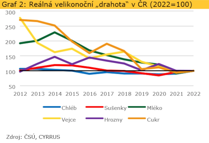 Na příkladu široce diskutované „velikonoční drahoty“, jsme se pokusili ukázat, že pro vyhodnocení skutečného tempa poklesu kupní síly obyvatel je nutné vždy přihlížet kromě samotných cen i ke druhé straně stejné mince, tedy k příjmům. Zároveň je vhodné při posuzování cenového vývoje zohledňovat i vývoj historický.