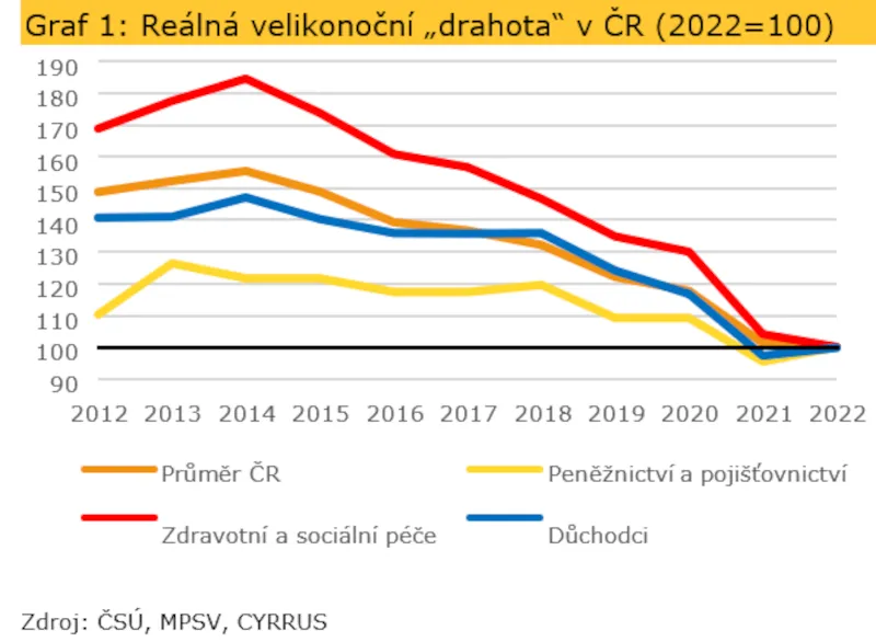 Ano, i letošní Velikonoce budou z pohledu celkové cenové hladiny „nejdražší v historii“. Totéž ostatně platilo i o všech předchozích Velikonocích. Každoroční růst cenové hladiny je v západním světě nejen naprosto běžným jevem, ale je dokonce i explicitním cílem centrálních bank. Pohledem na cenovky v obchodech ovšem nezjistíme, zda Češi skutečně chudnou či bohatnou. Informační hodnota cenovky bez kontextu je nulová. Cílem této analýzy je dodat letošním českým Velikonocům právě tento kontext.
