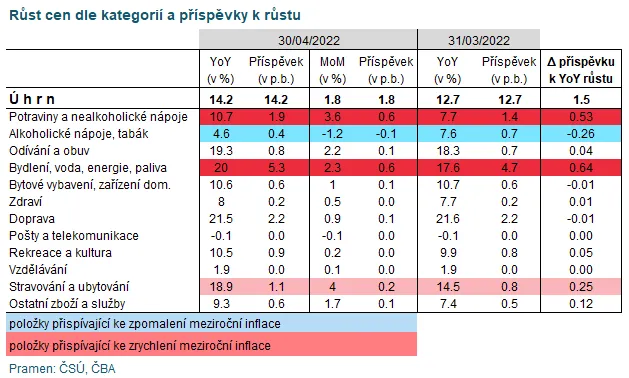 Spotřebitelské ceny stouply v dubnu o 14,2 % v porovnání se stejným měsícem loňského roku, což je o 1,5 procentního bodu víc než v březnu. Oznámil to Český statistický úřad (ČSÚ).