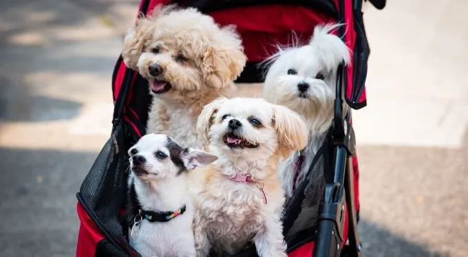 Vozíky a tašky: Pro malé psy, štěňata, seniory nebo psy po operaci jsou vozíky a tašky (či batohy) nenahraditelným pomocníkem. Poskytují bezpečný a pohodlný způsob přepravy, který zároveň usnadňuje majitelům pohyb. Tyto produkty jsou často skládací a snadno přenosné. Některé se dají připojit za kolo, další jsou regulérní kočárky.