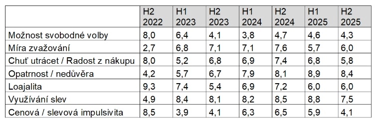 Poslední dva roky ve slevách podle dat průzkumu nakupovalo od 81 do 88 % lidí. V druhé polovině letošního roku tento podíl klesl na 75 % respondentů. A zatímco loni přiměla sleva k nákupu 65 % respondentů, teď je to 41 %, tvrdí průzkum.