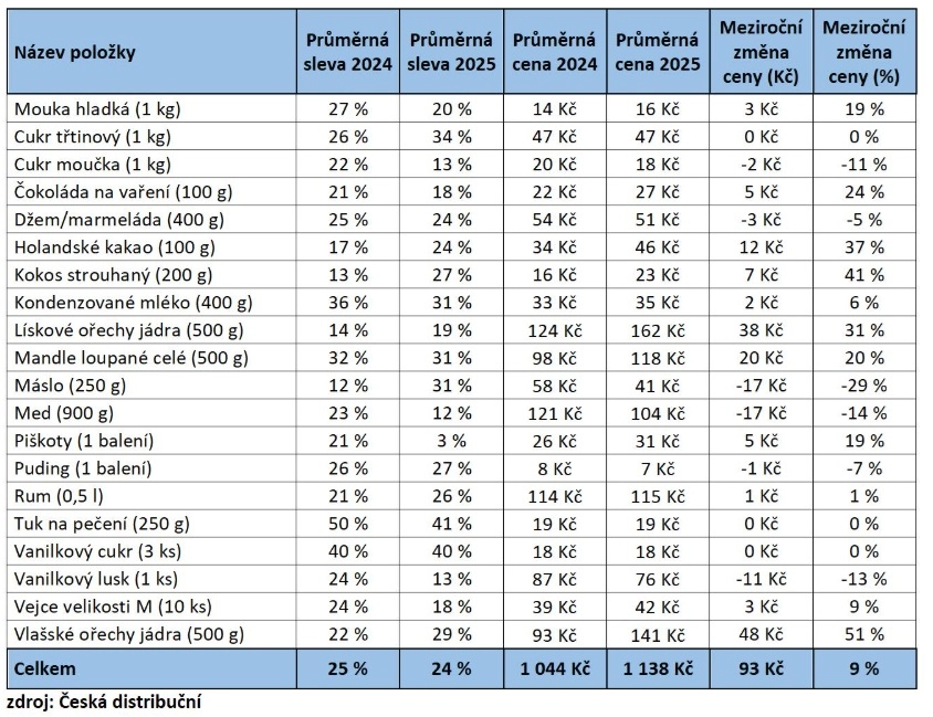 Suroviny na vánoční pečení letos meziročně zdražily zhruba o desetinu. Balík dvaceti vybraných položek vyjde v průměru na 1138 korun, bezmála o stokorunu víc než loni v prosinci. Vyplývá to z nové analýzy akčních letáků sedmi největších obchodních řetězců, kterou zpracovala společnost Česká distribuční.